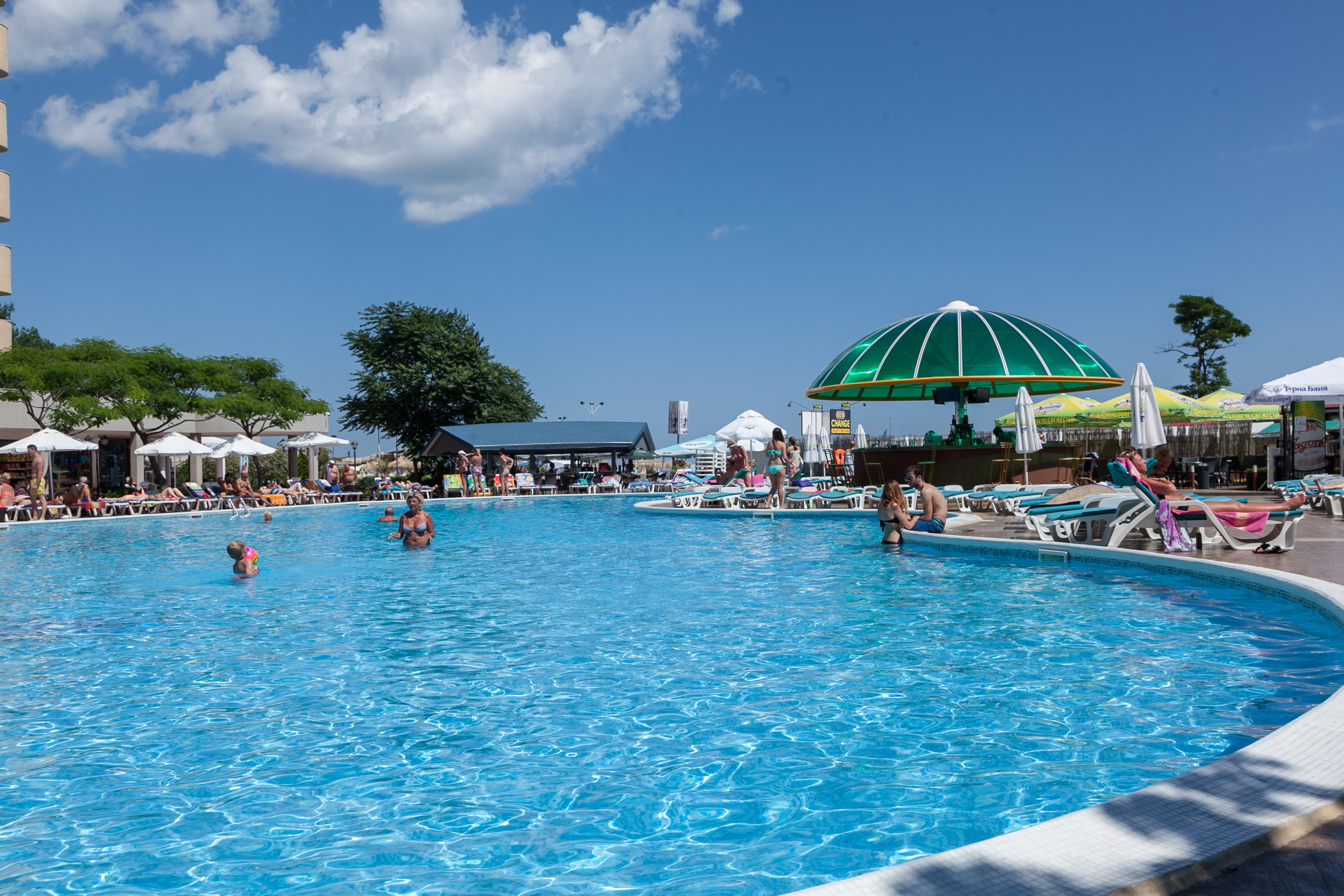 Ingyenes kültéri úszómedence, napernyők és napozóágyak a medence mellett, térítés ellenében biliárd és masszázs használható. A gyerekeket gyerekrészleg a medencében és játszótér várja.