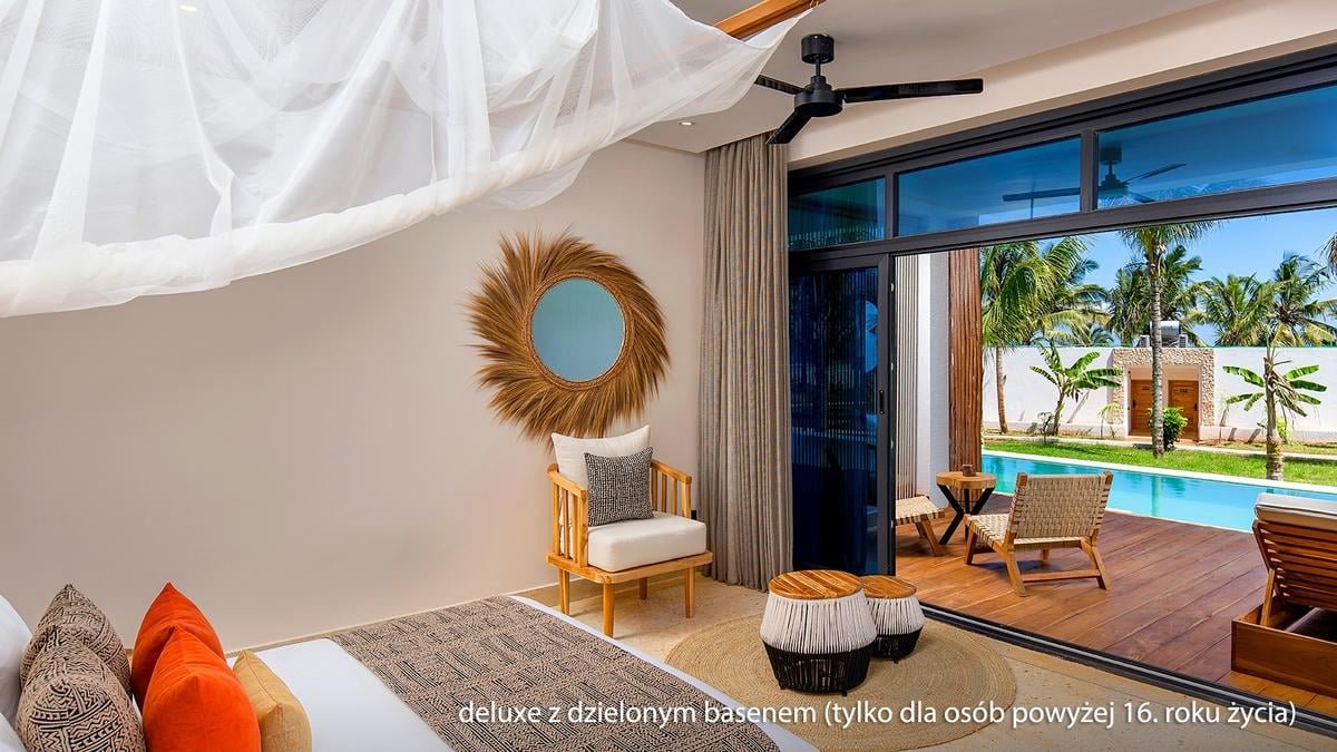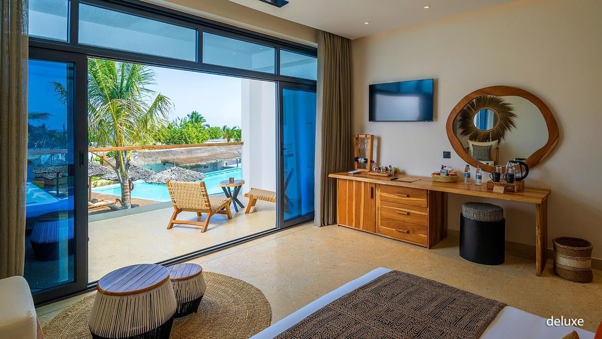 A 50 m²-es szoba közvetlen hozzáférést biztosít a megosztott úszómedencéhez. King size ággyal, zuhanyzós fürdőszobával és ülősarokkal felszerelt, valamint terasszal rendelkezik, ahonnan közvetlenül a vízbe lehet lépni.